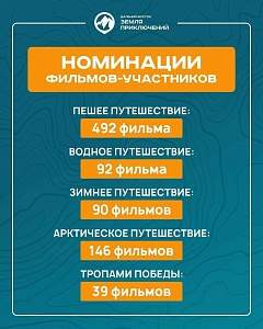 Наибольшей популярностью среди участников пользовалась номинация «Пешее путешествие» (492 фильма), отражающая любовь россиян к исследованию просторов пешком. Также востребованными оказались номинации «Водное путешествие», «Зимнее путешествие» и «Арктическое путешествие».